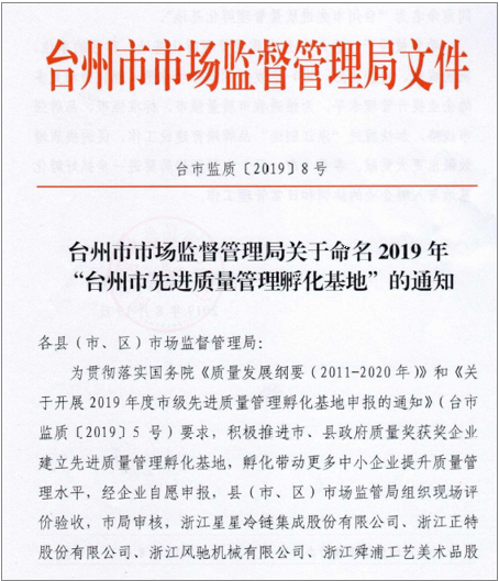 2019年8月19日,臺州市市場監(jiān)督管理局發(fā)布了臺市監(jiān)質(zhì)[2019]8號文件關(guān)于命名2019年“臺州市先進(jìn)質(zhì)量管理孵化基地”的通知,我公司在2019年度臺州市級先進(jìn)質(zhì)量管理孵化基地申報項(xiàng)目申報工作中,經(jīng)市場監(jiān)管局組織現(xiàn)場評價驗(yàn)收,市局審核,同意命名為“臺州市先進(jìn)質(zhì)量管理孵化基地”。
