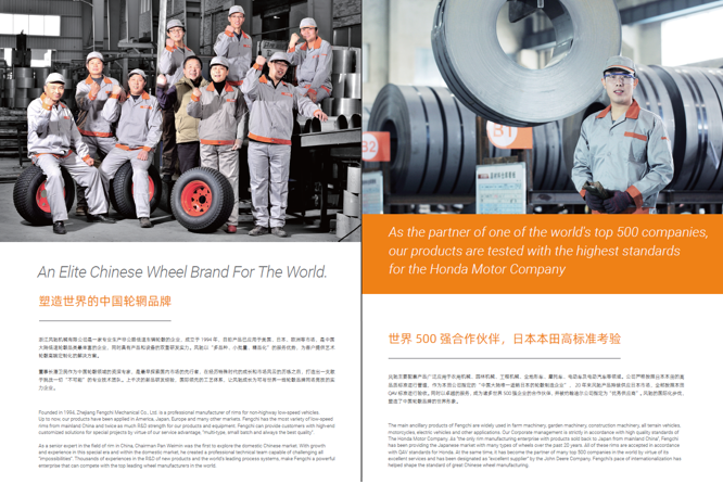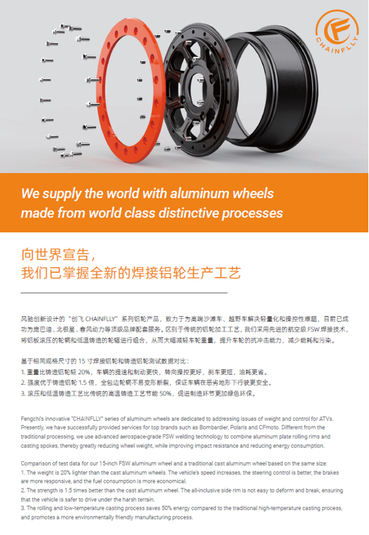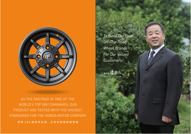 浙江風(fēng)馳機(jī)械有限公司,成立于1994年,伴隨著時間的飛逝,一直以工匠精神專注生產(chǎn)非公路低速車輛輪轂,在董事長潘衛(wèi)民的英明帶領(lǐng)下,風(fēng)馳以自信、沉穩(wěn)、堅實的腳步,企業(yè)逐步成為了世界500強(qiáng)合作伙伴、申請了企業(yè)獨有的輪輞品牌、創(chuàng)立了旗下5家子公司、獨創(chuàng)特殊工藝、產(chǎn)品革新?lián)Q代,一直以實現(xiàn)“引領(lǐng)低速車輪發(fā)展,為中國制造正名”的使命及成為“全球知名低速車輛制造企業(yè)的最佳戰(zhàn)略合作伙伴”為愿景而一直努力著。