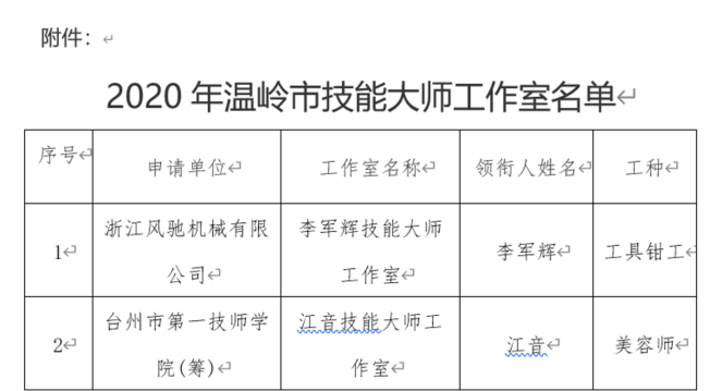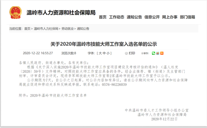 我司根據(jù)《關(guān)于深入實(shí)施2020年度溫嶺市技能大師工作室項(xiàng)目建設(shè)及考核評估的通知》(溫人社發(fā)〔2020〕59號)文件精神,通過自行推薦以及地方政府的大力支持,充分準(zhǔn)備了相關(guān)申報(bào)資料,通過主管部門的初審以及專家的評審、部門審議和社會公示等評選環(huán)節(jié),我司最終順利通過評審,被評定為“李軍輝技能大師工作室”并于政府平臺公示。